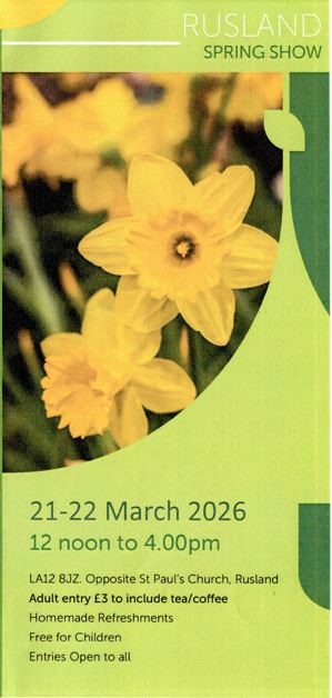 Rusland holds a Spring Show every March/April, at the Rusland Reading Rooms, organised by the Reading Room Committee. Entries are open to anyone, and the hall and marquee is always a riot of colour with spring bulbs, pasche eggs, decorated cakes, photographs, paintings, poems, with children’s entries adorning the walls. Tea and delicious cakes are on sale from the kitchen. The Show helps to raise important funds for the upkeep of the Rusland Reading Room (village hall).